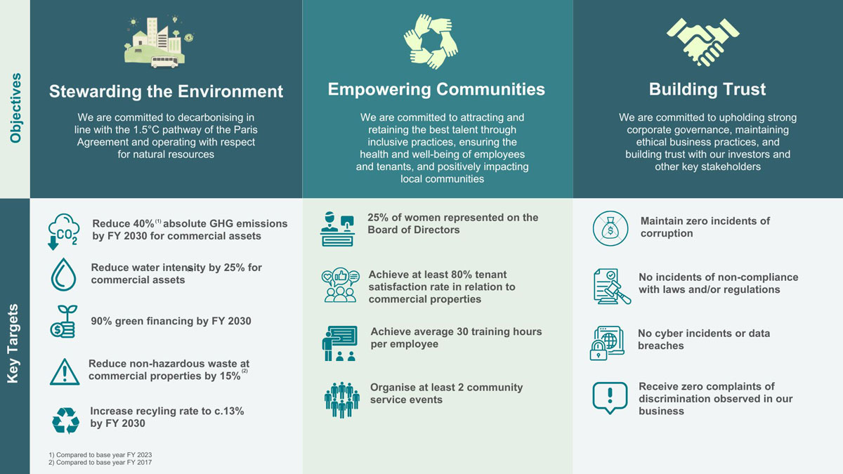 OUE REIT recognises that the evolving sustainability landscape, such as climate change and investors’ expectations, is having an increasing impact on our operations. To deliver long-term economic and social values to the stakeholders, its sustainability strategies prioritise on driving economic growth and fostering operational resilience, with a goal to support the global transition towards sustainability.